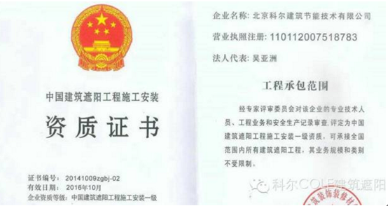 近期,中國建筑裝飾裝修材料協會建筑遮陽材料分會公布了首批36家獲得建筑遮陽工程施工安裝資質企業名單,其中全國有11家企業獲得一級資質,北京科爾建筑節能技術有限公司榜上有名。