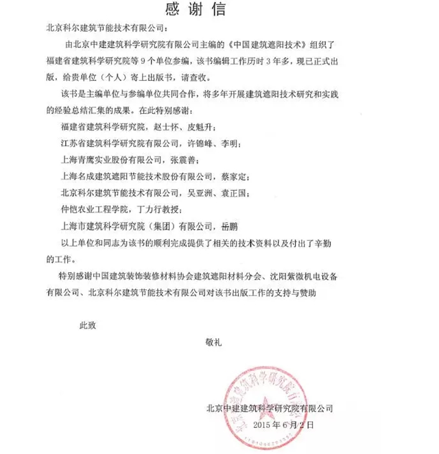 2015年5月,北京科爾建筑節(jié)能技術有限公司作為北方地區(qū)唯一指定建筑遮陽企業(yè)代表參編的《中國建筑遮陽技術》一書成功出版發(fā)行。該書由中國建筑節(jié)能界泰斗級人物涂逢祥老先生牽頭,北京中建建筑科學研究院主編。