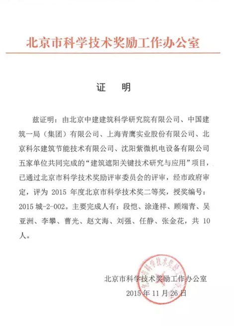 近日,由北京科爾建筑節能技術有限公司,北京中建建筑科學研究院有限公司,中國建筑一局(集團)有限公司等5家單位共同完成的“建筑遮陽關鍵技術研究與應用”項目,已通過北京市科學技術獎勵評審委員會的評審,經北京市政府審定,評為2015年度北京市科學技術獎二等獎,授獎編號:2015城-2-002。