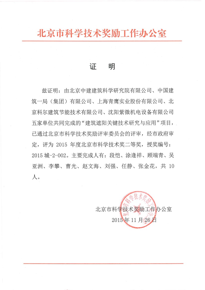 近日,由北京科爾建筑節(jié)能技術(shù)有限公司,北京中建建筑科學(xué)研究院有限公司, 中國建筑一局(集團(tuán))有限公司等5家單位共同完成的“建筑遮陽關(guān)鍵技術(shù)研究與應(yīng)用”項目, 已通過北京市科學(xué)技術(shù)獎勵評審委員會的評審,經(jīng)市政府審定,評為2015年度北京市科學(xué)技術(shù)獎二等獎,授獎編號:2015 城-2-002。